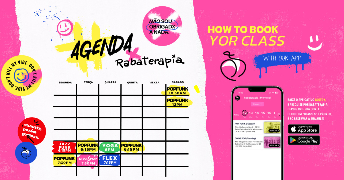 Tu peux réserver ton cours juste ici sur notre site web ou via notre appli Rabaterapia. L’appli est disponible sur iOS et Android. Il te suffit de créer un compte, d’acheter ton cours ou forfait, puis de réserver ta place!